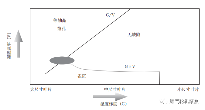 在燃氣輪機所涉及的大型定向結晶葉片制造工藝中,定向凝固技術(HRS)是關鍵技術之一。HRS從20世紀80年代開始已經被廣泛用于航空發動機定向結晶與單晶葉片制造中。此后,燃氣輪機也沿用了HRS技術,用以制造大型定向結晶葉片。但是,隨著葉片尺寸的增加,大型定向結晶葉片的工藝窗口很小,在鑄造過程中極易出現等軸晶、縮孔、雀斑等缺陷,如下圖所示。